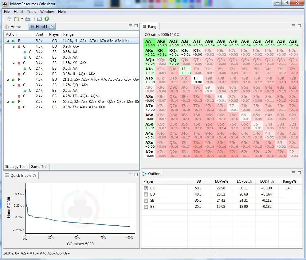 当然,如果在使用软件时,比如往里输入一手泡沫期的牌局,若是把对手的全下范围输入错误,那我们得到的答案大概率也是不太可信的,然而一旦使用得当,软件给出的在各种情况中的最佳处理方式,对于我们来说是极具价值的。同时,通过软件找答案,这对我们的心理也是有好处的,如果知道我们在某种情况输了只是因为运气不好而不是失误,那我们就更容易释怀,若是软件告诉我们是因为失误造成,那就说明我们还有进步空间。