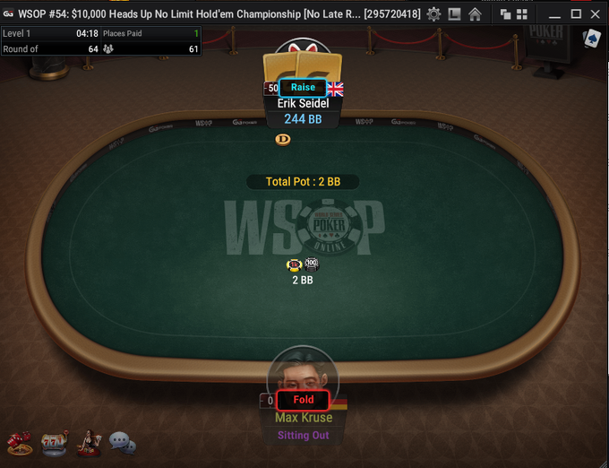 在GGPoker上10,000美元买入的单挑比赛第二轮中,扑克名人堂成员对阵足球明星Max Kruse。然而,Seidel的对手并没有及时出现在比赛中,这位扑克界的传奇人物充分发挥了优势。