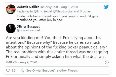 Seidel的老对手Olivier Busquet也为这位扑克名人堂成员进行了辩护,认为他并不需要为自己的行为说谎,也不需要太过在乎那些键盘侠的意见。