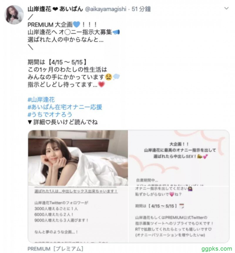 要怎么中奖呢?首先,你必须要有自己的twi帐号,并且发文要标签「#山岸逢花」、「#あいぱん在宅オナニー応援」以及「#うちでオナろう」,至于要写什么内容呢?你要帮忙山岸想一个在家DIY的方式,最有创意的投稿者就可以得到她。