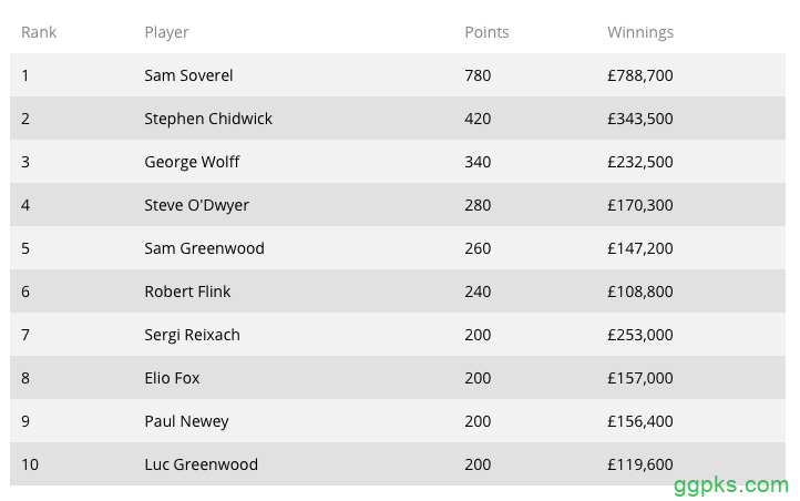 Sam Soverel在BPO开场时发挥的就相当稳健,陆续斩获两个亚军后终于迎来属于自己的冠军,但一切似乎才开始,在第8项赛事£25,000 NLH中他力战群雄再次将比赛桂冠收入囊中,奖金£227,500。