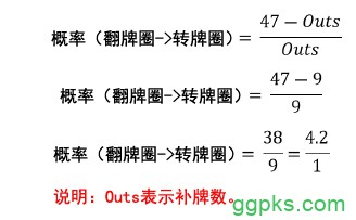 赔率:(翻牌圈-->河牌圈)= 补牌数 x 4 - (补牌数 - 8)(注意,只在补牌超过9张时才需要减去后项)