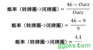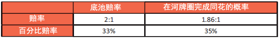 赔率:(翻牌圈-->转牌圈)= 补牌数 x 2 + 1% 或 2%(若补牌超过5张,则加1%;若补牌超过13张,则加2%。)