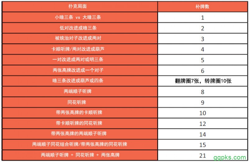 下面的表格(表3)列出了典型德州扑克局面的补牌数。