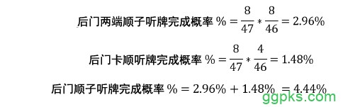 在翻牌圈已经拿到J-T-9三连的情况下,完成后门顺子听牌(BDSTD)的概率等于在转牌圈拿到一张Q或8(得到8张补牌的两端顺子听牌)的概率加上在转牌圈拿到一张K或7(得到4张补牌的卡顺听牌)的概率。