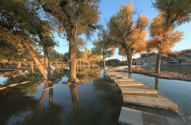 我相信很多人一定看过《英雄》这部电影,里面的一个镜头也会让你不断的倒退,翻来覆去的看好几遍,就是穿着一身红衣的张曼玉在一片胡杨林下尽情的舞剑,我们不仅是被张曼玉曼妙的身姿所吸引,也被她的演技所折服,但是最让观众印象深刻的就是她所在的那个场景,一片黄灿灿的景象,搭配上红色的衣服,整个景象十分的壮美。于是就有很多人爱上了这番景象,迫不及待的想要去亲身感受一番。